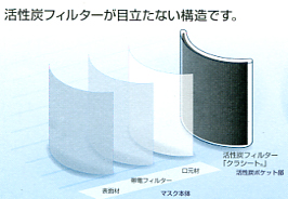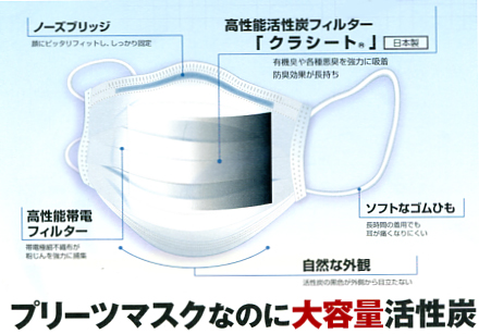 中、軽度の患者さん用 1.強力活性炭使用により、脱臭吸着効果が、抜群です。 2.特殊な穴アキ不織布を使用しておりますので、ソフトタッチで息苦しさや暑苦しさがありません。 3.マスクのフィルター効果(BFE98.2%)を備えています。 用途 臭いの発生する作業環境 ○石油化学工場 ○製薬工場 ○塗料・塗装工場 ○自動車修理工場 ○肥料工場 ○各種研究所 ○除草・殺虫作業…等 活性炭シートは、上記のキーメイトマスクと同じシートです。 特殊なウレタンフォ一ムに、吸脱着性のよい精製されたクラレケミカルのヤシガラ粉状活性炭を特殊樹脂加により強固に接着させたものです。通気性、集塵性などの性能に加えて亜硫酸ガス、硫化水素ガス、その他悪臭のある有機ガスの吸着除去に優れた効果のある多孔性の特殊吸着体で、画期的な製品です。 マスクのフィルター効果(BFE98.2%)を備えています。 BFE(Bacterial Filtation Efficiency) 入数 20枚/箱 マスクサイズ:高さ×巾 96×172mm 活性炭シートサイズ:74×100mm ヤシガラ活性炭を使用しています。 ソフトなポリウレタン製のゴム紐を使用 ノーズフィットは、樹脂製です。(金属では、ありません。) 活性炭シートは、日本製で、マスク本体は、中国製です。 |