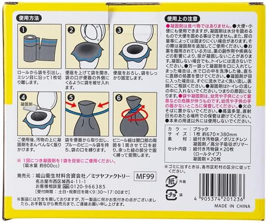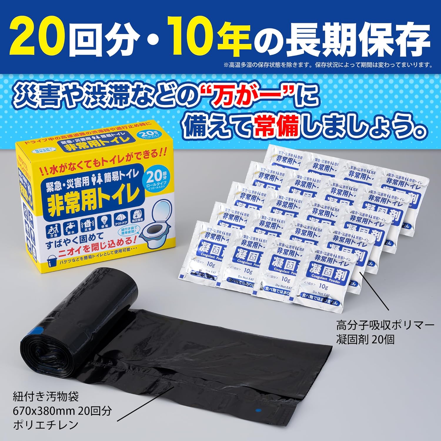 ・セット内容:汚物用ポリ袋20枚(黒・紐付き)と凝固剤20個(各10g)のセット ・吸収性能:1回あたり約800ccの吸収量で、成人の平均排尿量(300~400cc)に対応 ・使用回数:4人家族で約1日分(1日4~6回の排尿を想定)の使用が可能 ・ポリ袋仕様:サイズ約67cm×38cm、厚み0.3mm、密閉可能な紐付きで衛生的 ・コンパクト設計:パッケージサイズ 幅18cm×高さ15cm×奥行7cmでスッキリ収納 |
